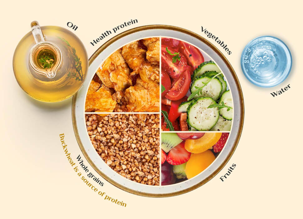 Healthy eating plate is a guide developed by experts at the Harvard School of Public Health that helps to build a nutritious diet. According to the research, buckwheat can fill as many as two of the four parts.