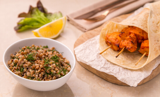 Serve the chicken kebab on a flat cake to keep it warm, with buckwheat sprinkled with chopped dill on the side.